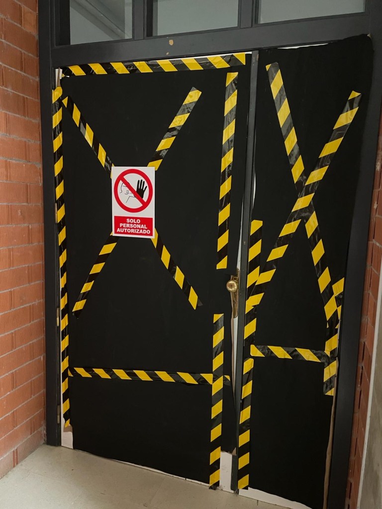 - Décoration murale : nous avons imprimé et plastifié des images apocalyptiques de l’Espagne crées par Chat GPT. Lien ici. Nous avons également placé des bandes oranges et noires pour rajouter un effet de danger.