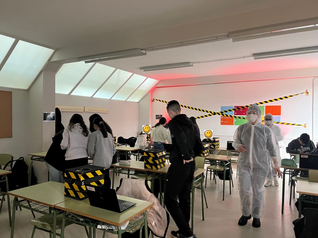 - Les costumes : Nous avons acheté des tenues de peintres jetables très bon marché, emprunté des lunettes de protection au département de physique et nous avons mis des masques. Cela a rajouté une ambiance supplémentaire à notre Escape et mis les élèves dans l’ambiance.